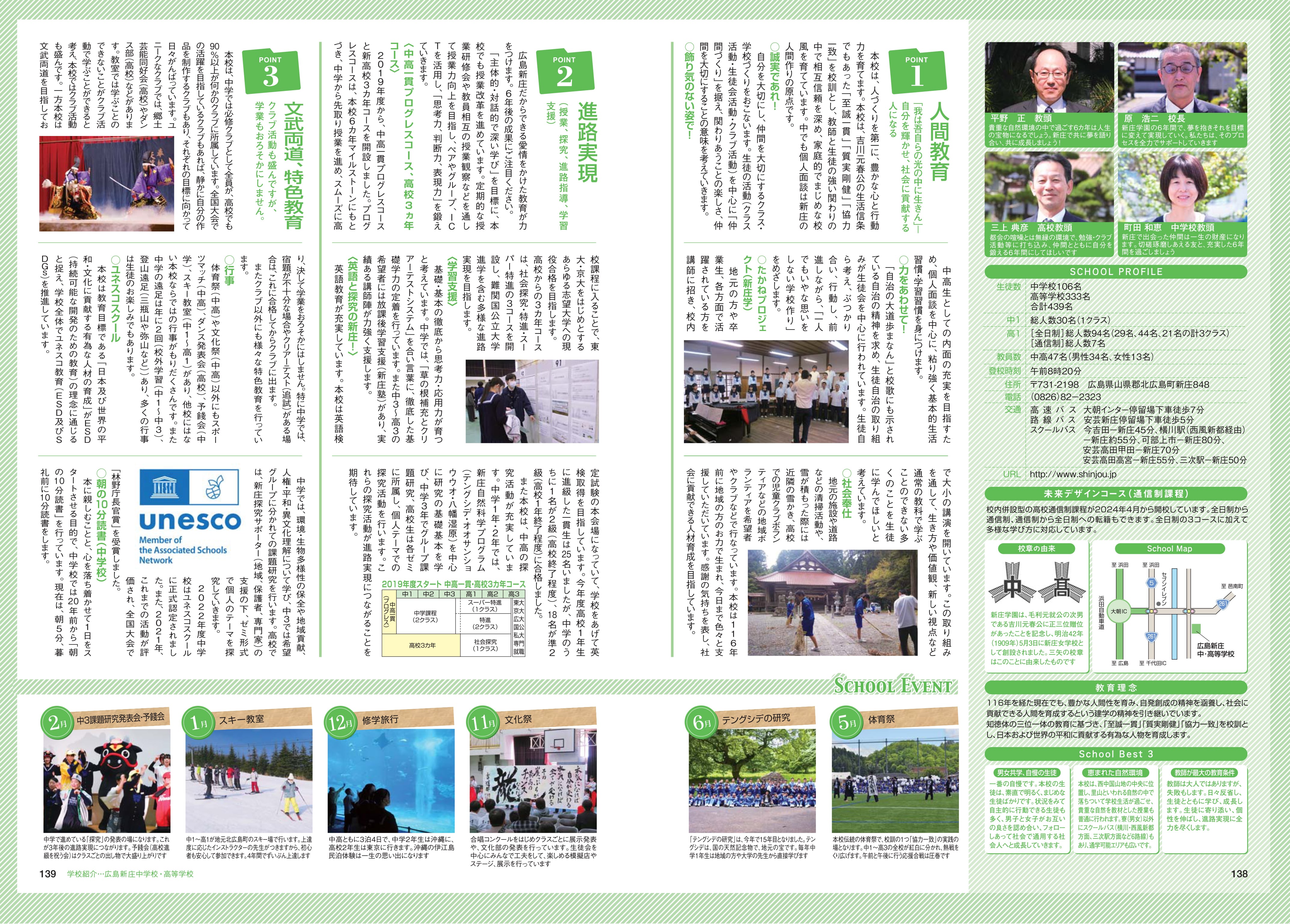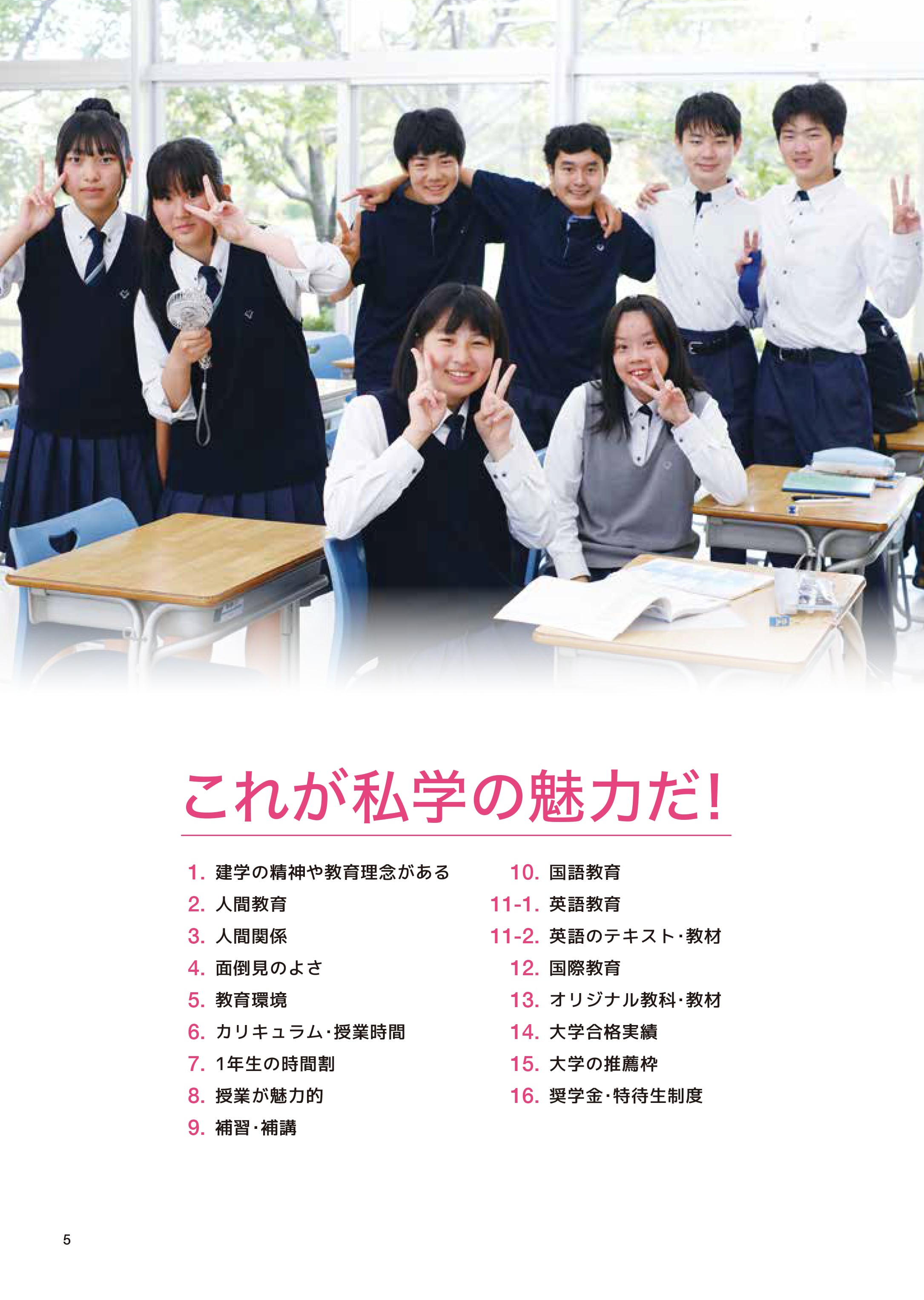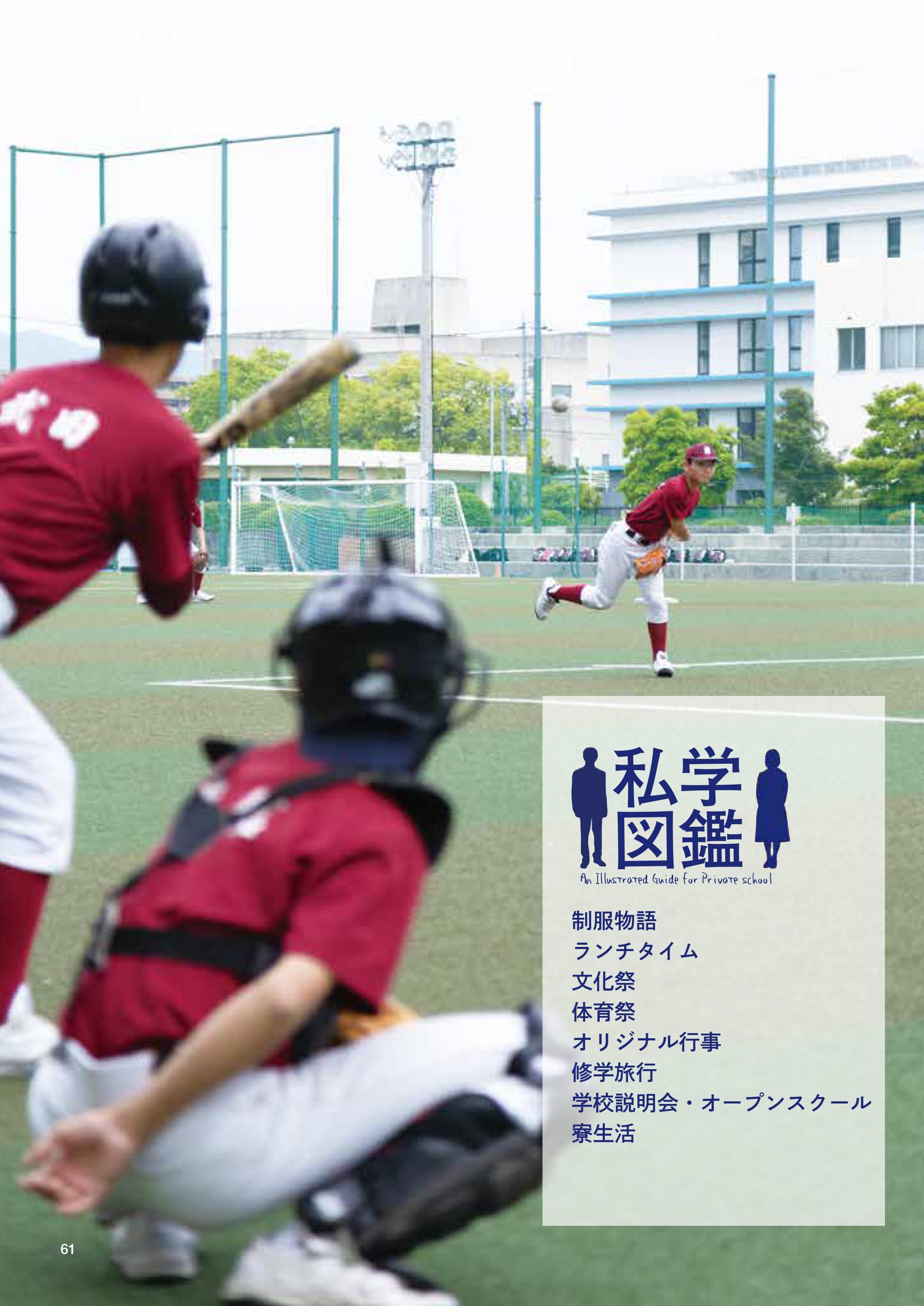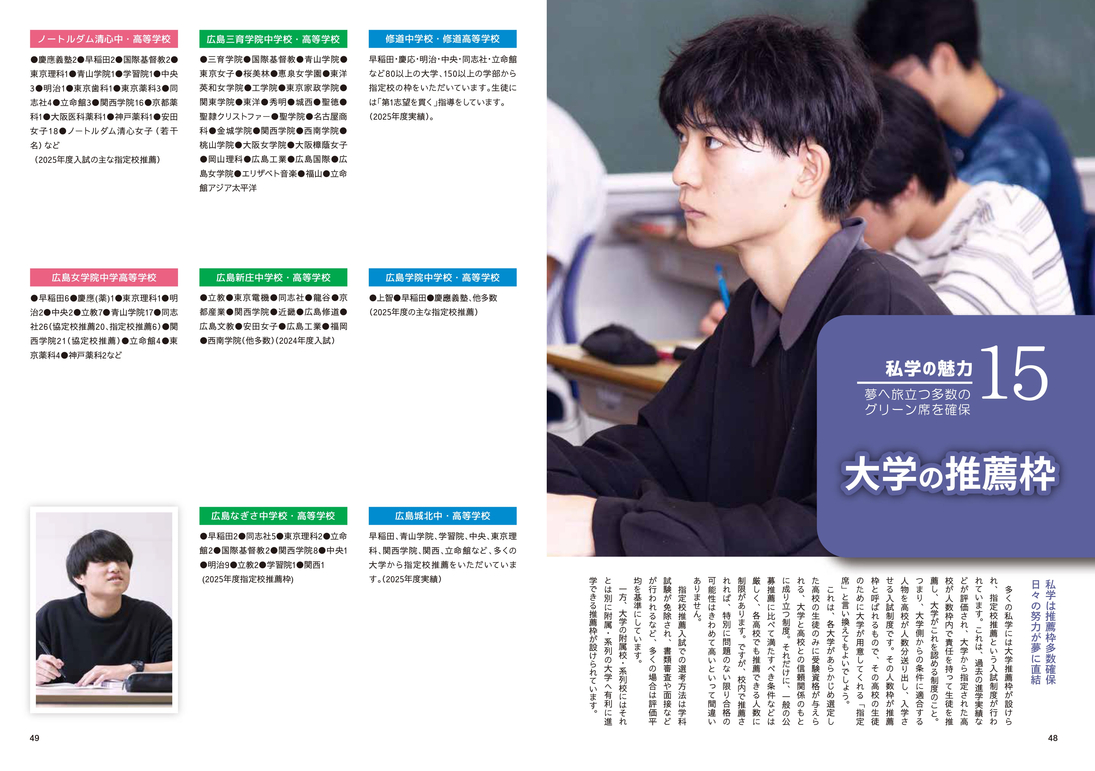 広島県内の代表的な私学である修道中学校・高等学校、広島学院中学校・高等学校、広島城北中・高等学校、広島三育中学校・高等学校、広島新庄中学校・高等学校、広島なぎさ中学校・高等学校、ノートルダム清心中・高等学校、広島女学院中学高等学校。この8校の魅力を徹底研究した全ページカラーの情報誌です。「私学の魅力」では建学の精神から奨学金制度といった17の観点からみた各校の魅力を紹介。「私学図鑑」では制服・ランチタイム・文化祭・体育祭・オリジナル行事・修学旅行・学校説明会・寮生活を紹介。そのほか各校の学習指導と大学受験対策、創立者の肖像、校長先生からのメッセージ、卒業生からの母校応援メッセージを掲載。「学校紹介」では各校の先生方、生徒のみなさんのご協力のもと、授業の様子・休憩時間の様子はじめ、さまざまな場面を徹底取材させていただき、豊富な写真と詳細な文章で、各校の魅力を楽しく存分に紹介しています。